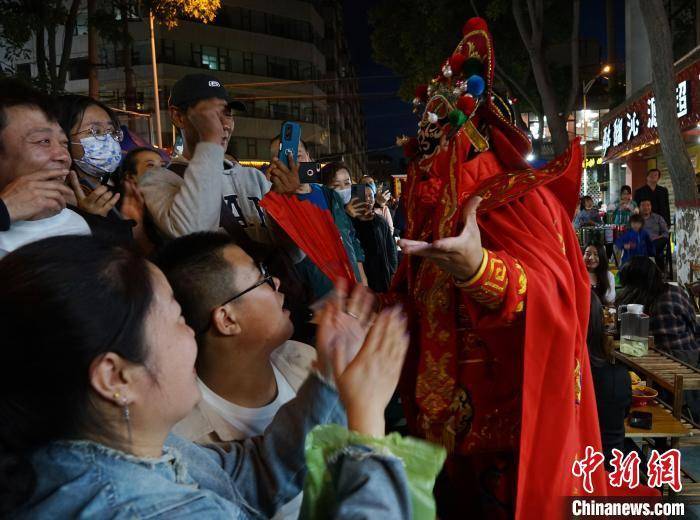 图为在西宁市城中区大新街夜市,商家表演“变脸”吸引游客。 马铭言 摄