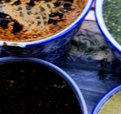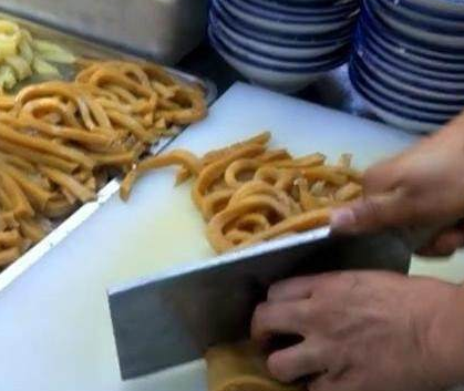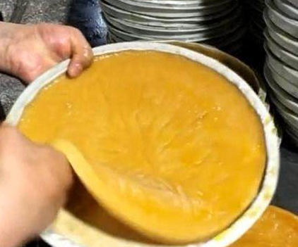 我排队的时候,大妈告诉我,这种小吃的制作方法是在小麦面中放入适量“蓬灰”,搓成面团后用清水把淀粉洗出,直到面团洗成蜂窝状的软胶状时才可以,这胶状体蒸熟后就称为“面筋”。然后将洗面筋的谁沉淀后,倒出清水,剩下的面糊舀到蒸盘中,蒸熟后即可调味。