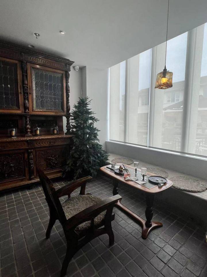 如果你喜欢安静,隔壁的中式茶馆是很好的去处,在河岸边品茶聊天,还是可以去看一株50年的红梅,为了留住它,装修的时候特地留住了生长空间,让它可以从房子穿顶而出。