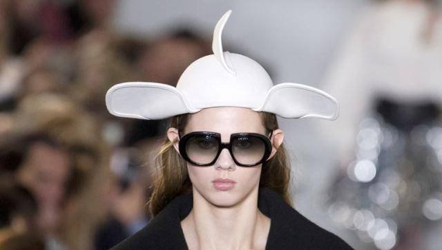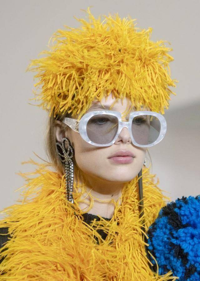 这一季的“头饰”设计绝对是一大重点。除了这顶“鲨鱼帽”或“小飞象帽”,还有这款“毛毛帽”,仔细看,这些毛毛是混合了皮革与“羽毛”的设计。你或与会偷偷窃笑,这个灵感难道是“鸟巢”吗?当然不是。