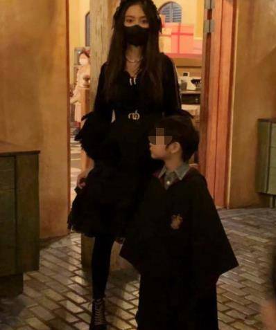 那天,宝宝带着儿子出现在上海迪士尼乐园参加万圣节活动。她穿着一件黑色的连衣裙,看起来很冷艳。宝宝在人群中美得亮眼,长腿又细又直,一点也不像生过孩子的妈妈。