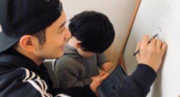 四岁的小海绵身穿黑系衣服,他已长过妈妈的腰,从五官上看,还是比较像爸爸黄晓明,整张脸嘟嘟的,超级呆萌。