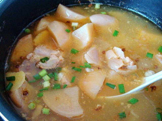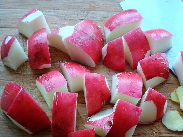 2、姜切成片,红萝卜洗净切大块,要用电高压锅炖,必须大块,这样不易炖碎,如果是沙煲炖,可以切小块