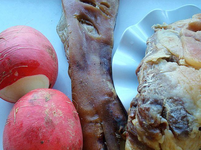 2、用凉水泡泡,多泡几小时去掉咸味,在用温水清洗,在温水里加一瓶盖的白醋,这样就容易洗掉晾晒时的灰尘和浮油了