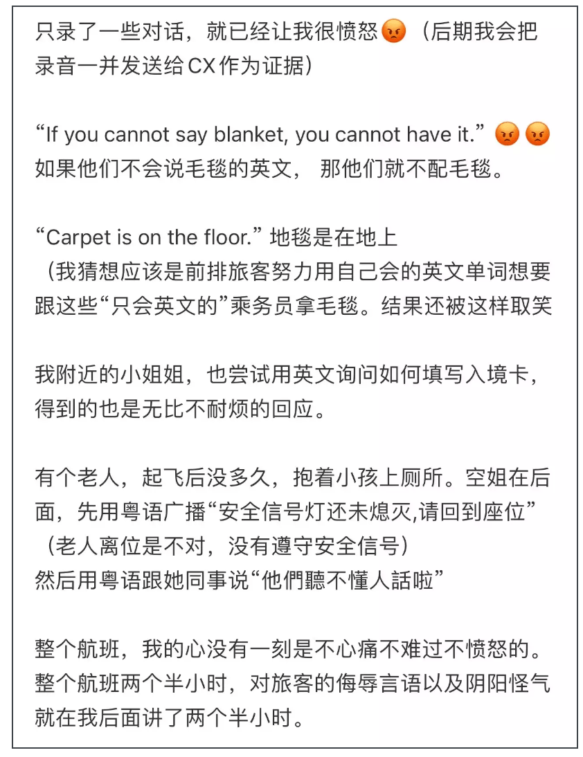 该乘客举例称,听到乘务员有“If you cannot say blanket, you cannot have it.”(如果他们不会说毛毯的英文,那他们就不配拥有毛毯)以及“Carpet is on the floor.”(地毯是在地上)等表述。