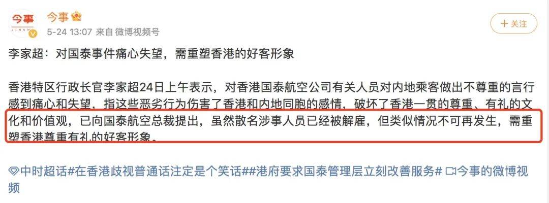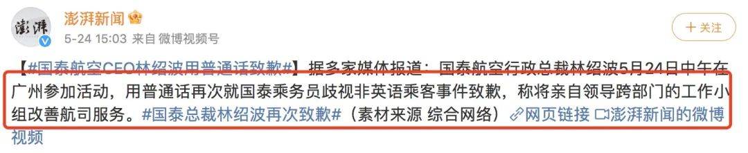 国泰航空也专门召开发布会,行政总裁林绍波专门用普通话道歉,并再次重申:“国泰航空将秉持‘零容忍’的态度,绝不姑息。将亲自领导跨部门的工作小组做出全面检讨。最重要的是确保所有国泰员工必须尊重来自不同背景及文化的旅客,在所有的服务地区均提供专业且一致的服务。”