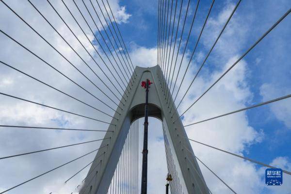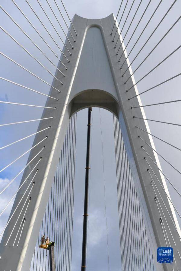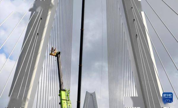 5月25日,工人在鹭洲大桥桥塔上吊装大桥名字。