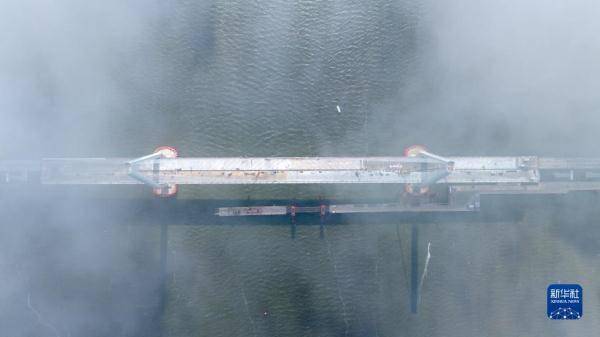 5月25日,工人在鹭洲大桥上铺设桥面(5月25日摄,无人机照片)。
