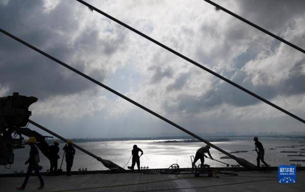 5月25日,建筑工人在鹭洲大桥上进行施工。