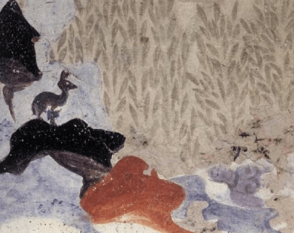 萨埵本生故事局部图中看出山顶上立有一只小鹿四蹄攒紧,惊恐地看着山下饿虎食人的场景。整个画面山峰、树林错落有致,形成图案般的背景。