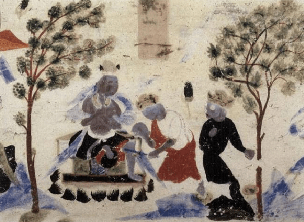 山峦与人物大小的对比与实际情况并不相符,正如画史中提到的传统绘画初期“人大于山”的技法。