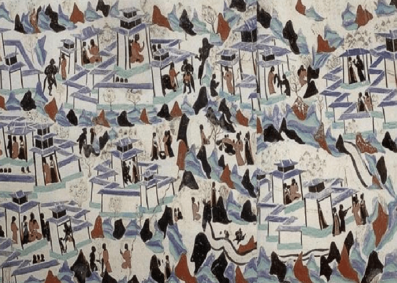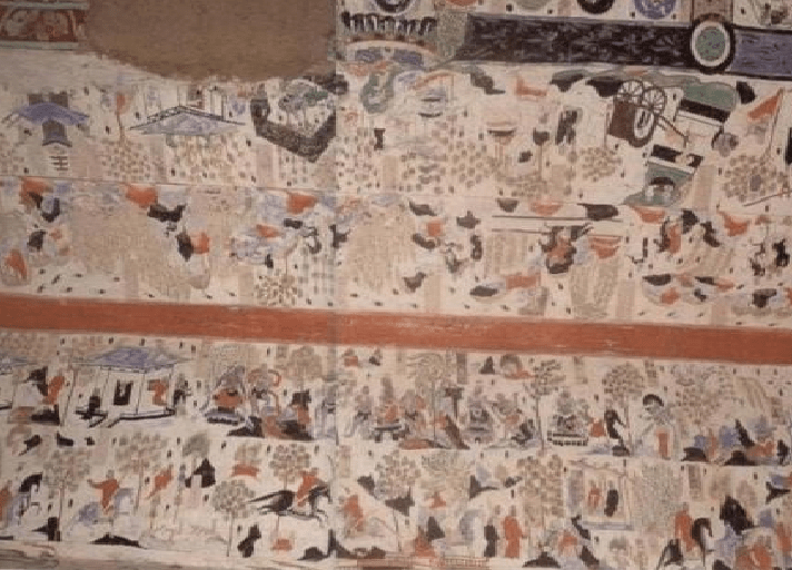 这幅大型故事画打破了北周以来形成的横向长卷式故事画,分层三段式的常规形式,以山峦和房屋为界形成了多个椭圆形画面,画面中的山峦、楼阁、树木既说明了故事发生的环境,又自然分隔开不同的故事情节,这与汉代画像石有着一脉相承的关系。
