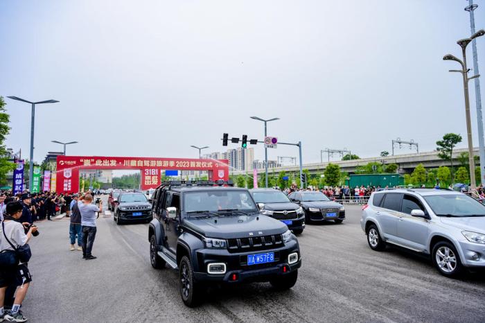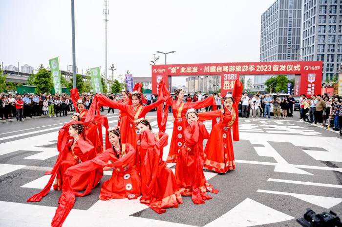 2023年5月27日上午,崇州市星鸣大道晴空万里,旌旗飘扬,锣鼓喧天,藏族同胞载歌载舞,自驾车辆摩肩接踵,成都咕哒自驾服务平台的“崇”此出发•川藏自驾游旅游季2023首发出征仪式在此举行。本次首发出征仪式汇聚了200余台川藏线自驾游车辆,600多名自驾游游客,“崇”此出发出征318川藏线,将进行为期7-9天的美好旅程,“崇”此出发•川藏线成都起始点高起点首发亮相。