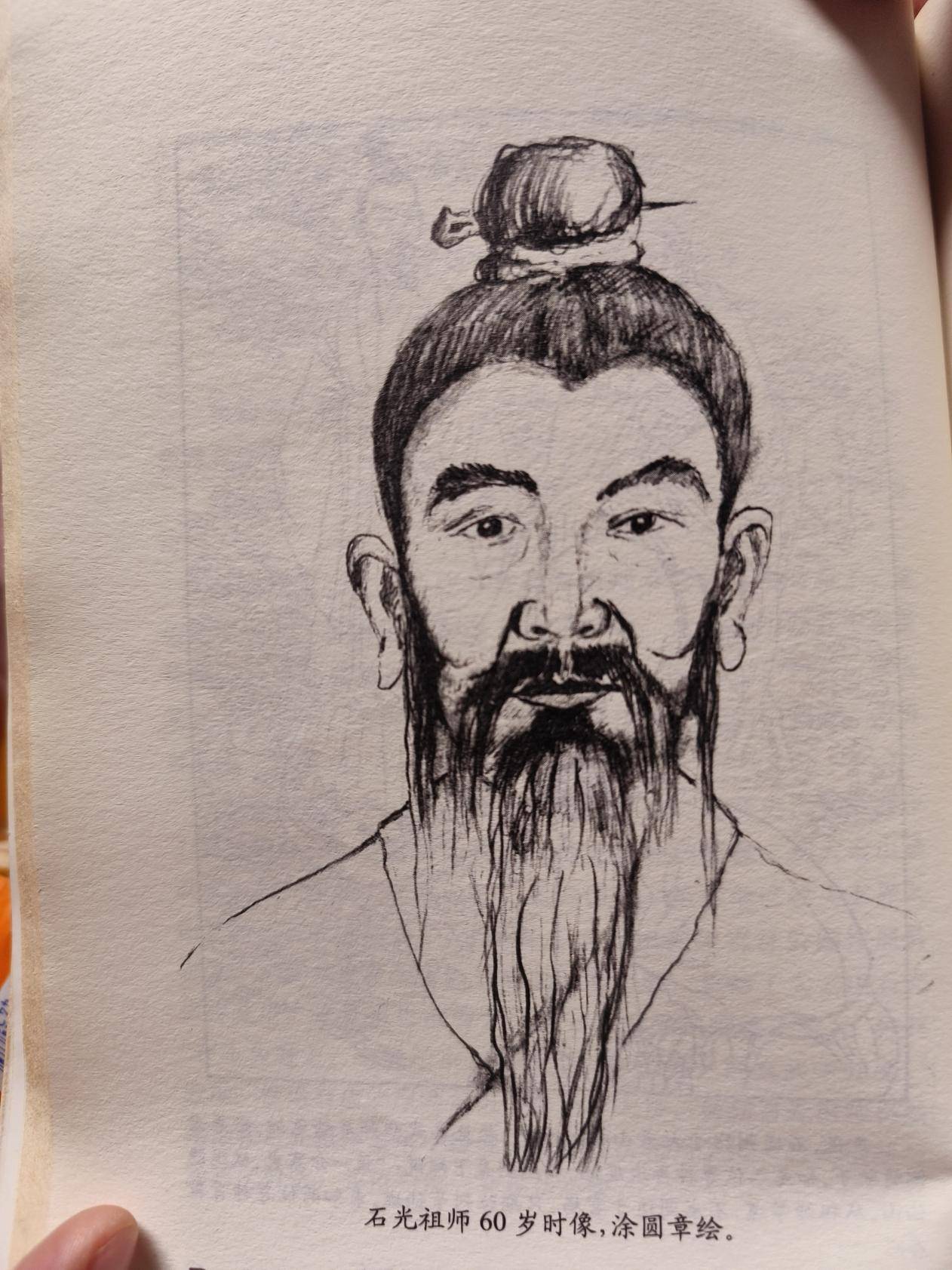 在天母宫,内供奉石光祖师,一坤道讲述了开山祖师石光祖师的故事,并在《大云山传说》书中找到了石光祖师60岁时的绘画像,确实仙风道骨。