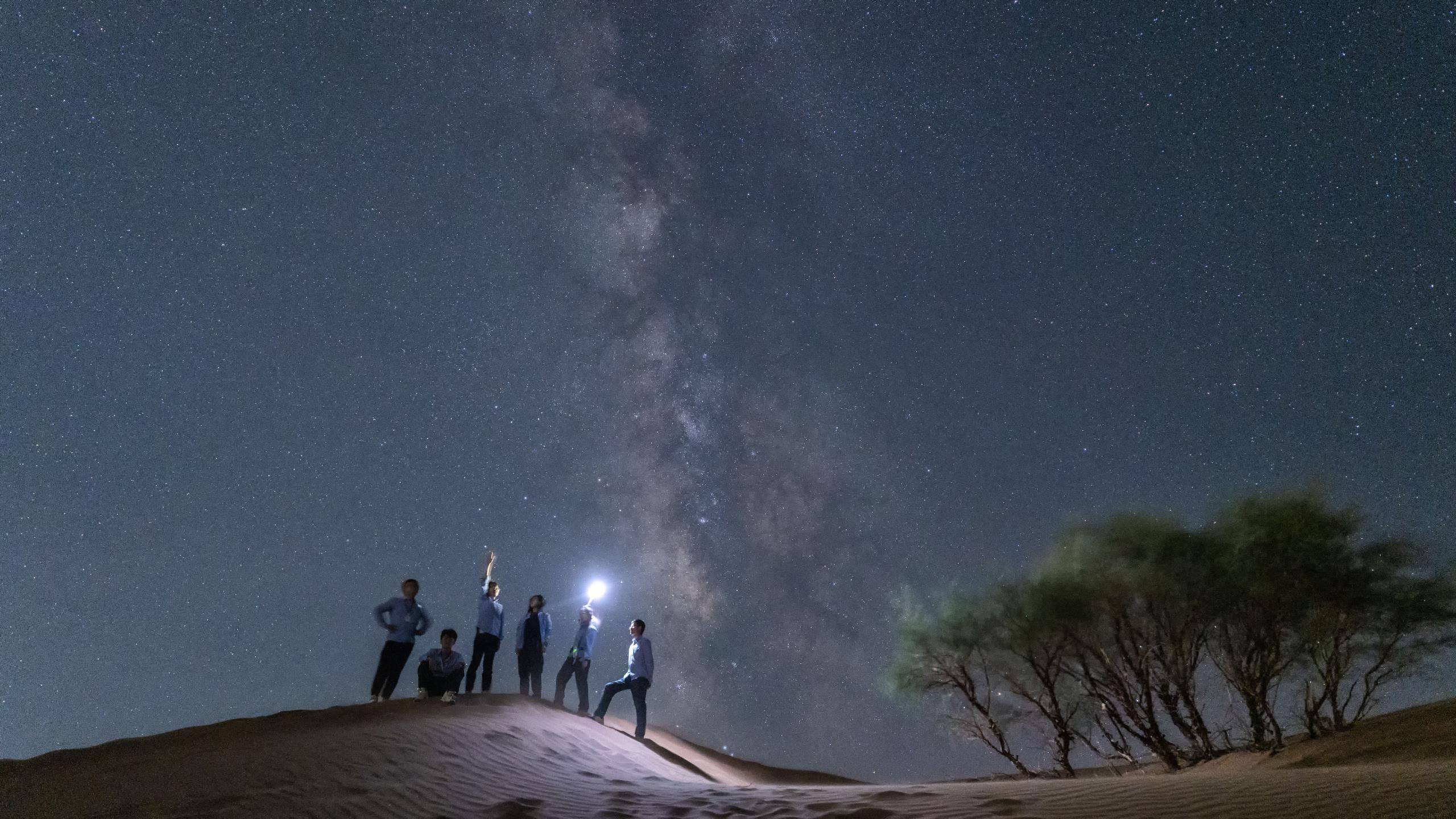 漆黑的沙漠中,“观星谷”不时传出孩童们兴奋的尖叫声。“大家看,北斗七星斗勺前部两颗星星,它们的延长线方向,就是北极星。”跟随着星空导师的绿色激光笔,游客们逐一认知星座,感受浩瀚星空。