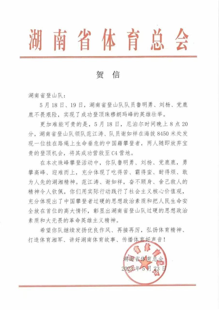 近日,湖南省体育总会向湖南省登山队发出贺信,祝贺几名队员成功登顶珠峰,也对范江涛和谢如祥两名队员的救人义举给予了高度赞扬。
