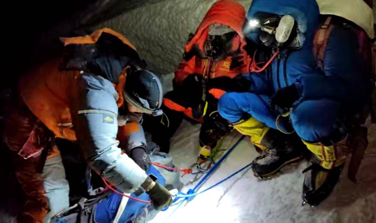 范江涛走近仔细查看,发现对方穿的是中国品牌的赞助服,于是判断这可能是一位中国登山者。范江涛凑近问道:“你是中国人吗?”见对方毫无反应,他又试着问了一句:“你叫什么名字?”那人才缓缓地说出了自己姓L(化名)。再一次检查,范江涛发现这位登山者的氧气已用完,脸部也覆盖了薄冰,生命体征微弱。而且因为她背后的下降器被锁死挂了2把主锁,所以整个人已被固定在主绳上无法移动,一个人无法完成自救。