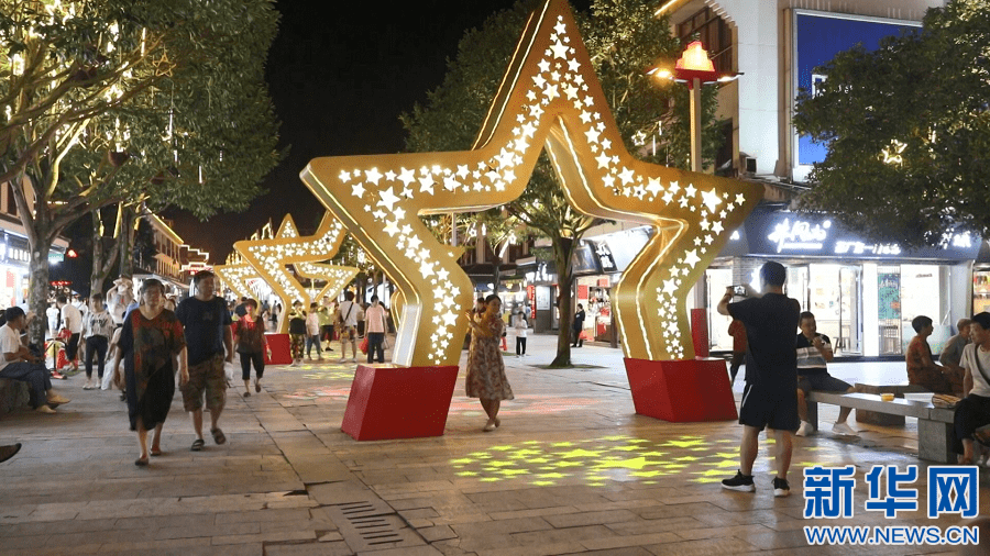 华灯初上,茨坪天街热闹非凡,白天游兴未尽的游客三五成群地来到这里感受多彩夜生活。“无名英雄”“红色军魂”“胜利之门”……当地打造的天街夜游将数字化与红色文化交融、新媒体与历史体验互补,为游客带来多维度沉浸式互动光影体验,在激活井冈山夜经济的同时,也让红色旅游融入人间烟火气。