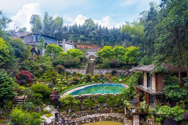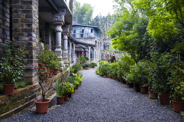 黄墙黛瓦的江南风格建筑中,人与自然生态融合的建筑巧思在这里随处可见,泡池旁栽植着绿意盎然的竹林灌木,泉水依山石而下,或从池底喷薄而出,自然而然就延伸出一段野趣风韵。