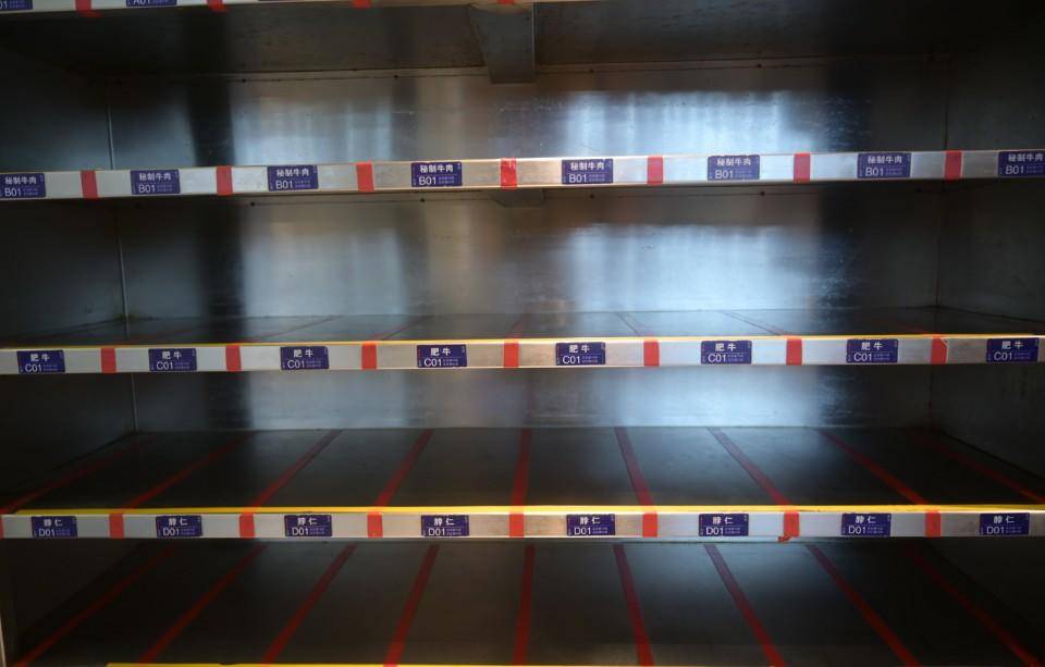 在置物架旁边的冰箱里,冷藏着尚未切割的牛肉。“晚上客人比较多,我们提前切好了一些牛肉片,用保鲜膜做了封膜处理,也一并放在了冰箱冷藏,这样顾客来了可以直接选取自己想要的部位,我们的肉都是当天新鲜切割的,顾客可以放心吃。”