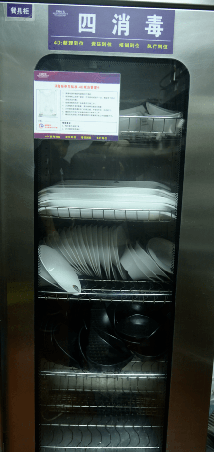 南城十里恒隆店后厨虽然相对较小,但执行的也是4D管理模式,厨房门口放有6个文件夹,分别记录了进货台账、检验合格证、4D检查表等文件,方便管理。