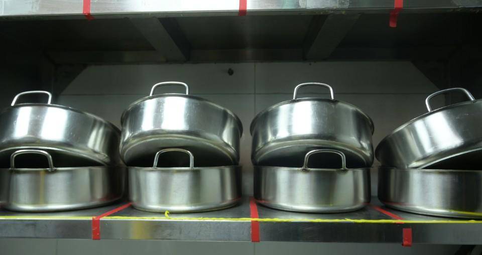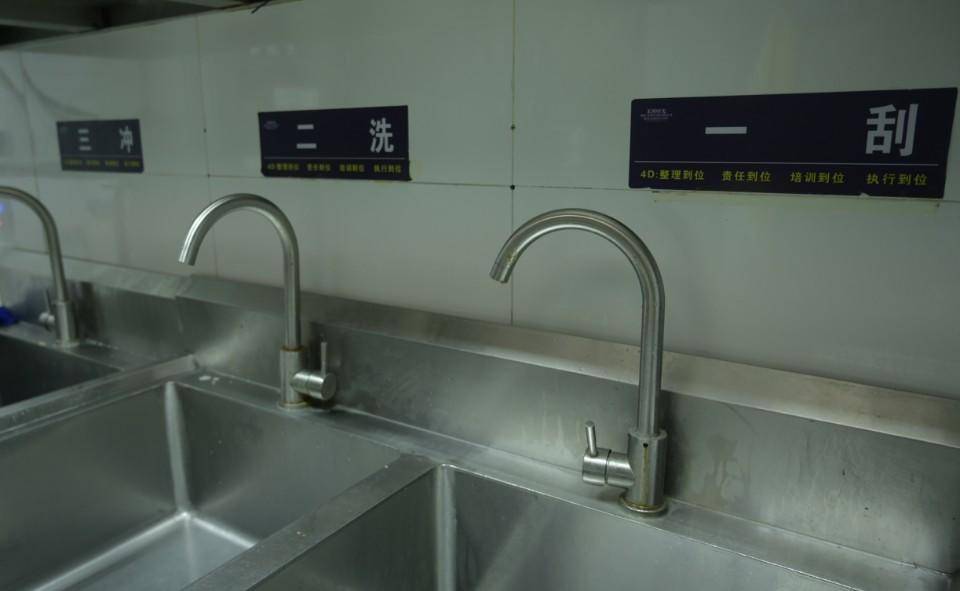 厨房置物间,清洗消毒之后的餐具和锅具也摆放在各自的位置。在后厨洗涮间,所有的餐具都需要经过一刮、二洗、三冲、四消毒,一个流程都不能少。