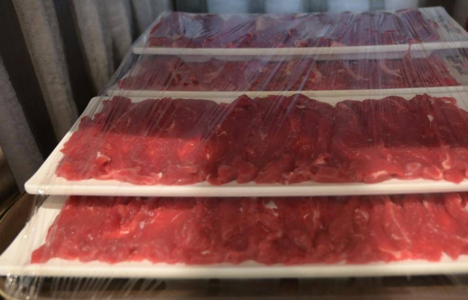 在南城十里鲜切火锅恒隆广场店,吧台对面就是肉类鲜切明档。“我们的家的涮肉都是新鲜切制,而且是明档操作,想吃什么部位的牛肉直接和师傅说。”酒店工作介绍,由于是闭餐时间,鲜切明档的置物架上已经空无一物,食品级不锈钢打造的置物架已经擦得干干净净。