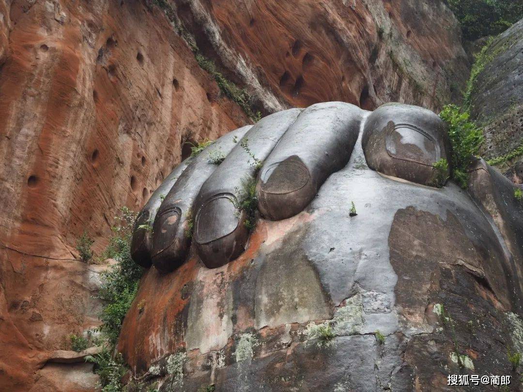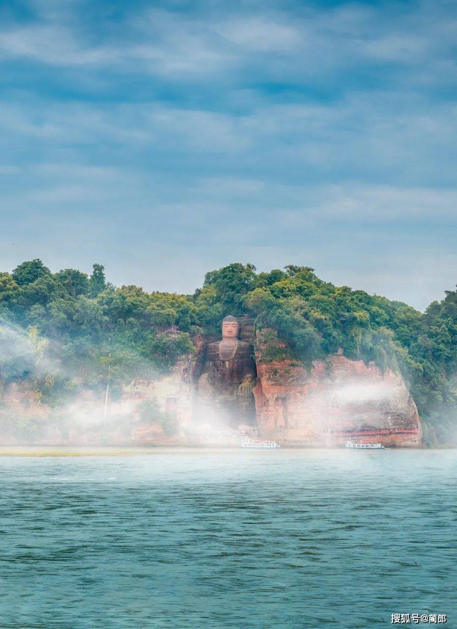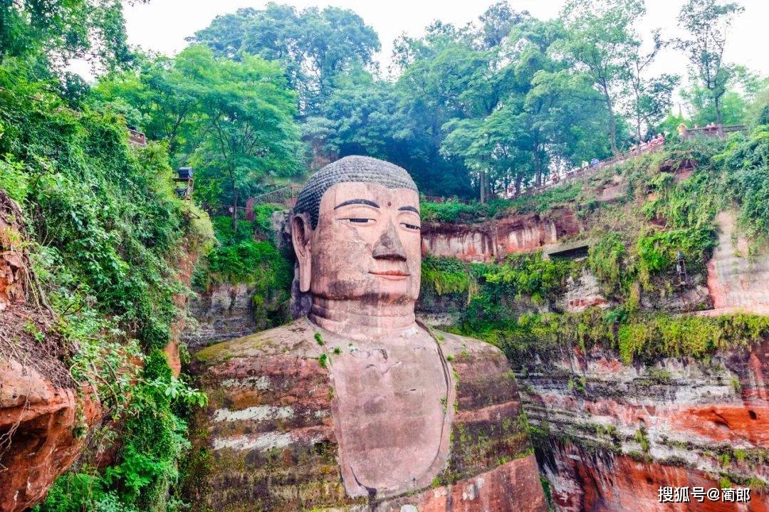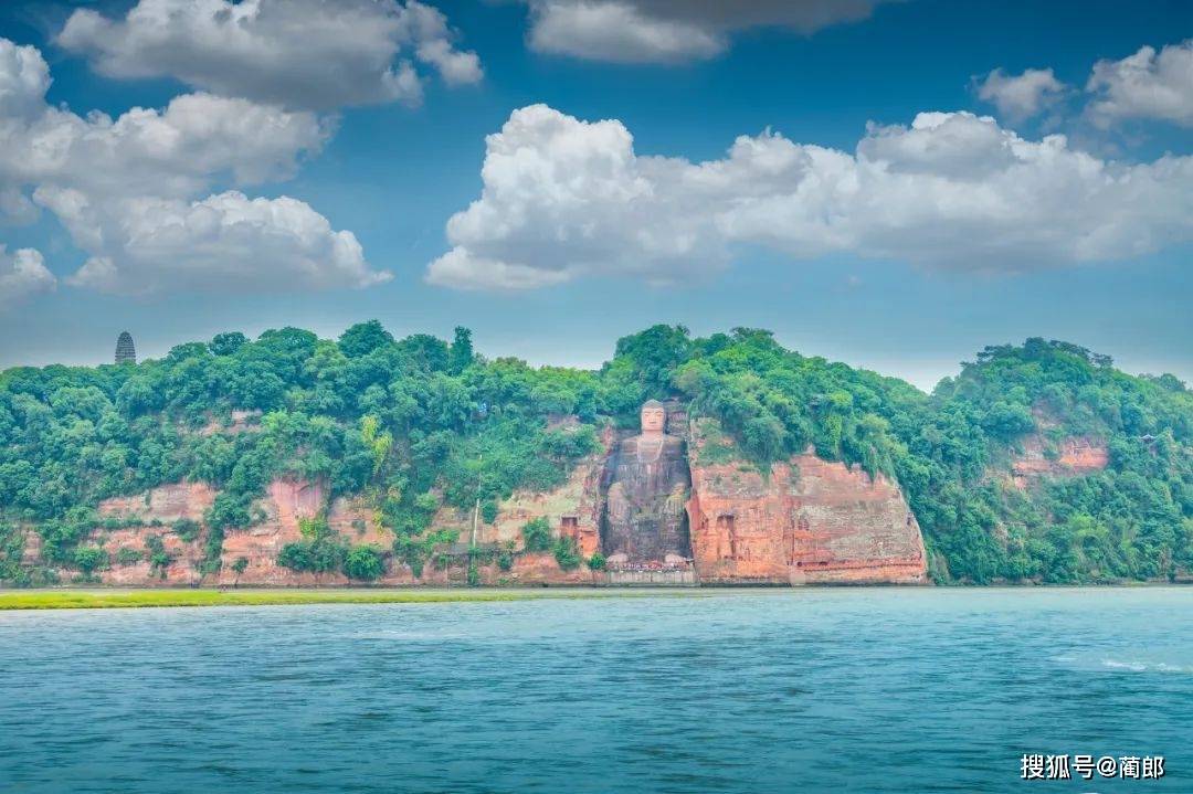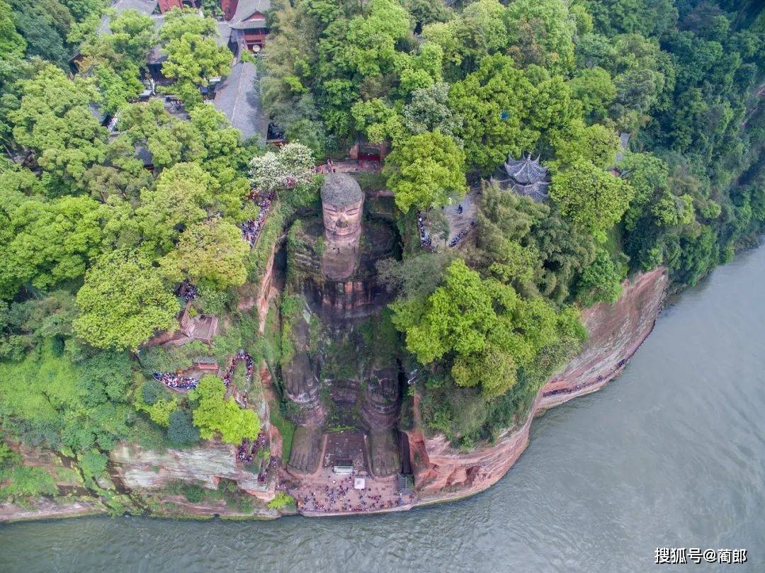 乐山大佛头与山齐,足踏大江,双手抚膝,