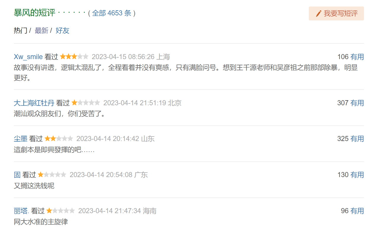 但所有亏损的电影里,反倒是《暴风》最不冤枉,电影制作粗糙、逻辑混乱、手法老套,导演不够用心,豆瓣首页5条短评都是差评,评分也低于及格线,观众吐槽网大水准一点都不夸张,在线免费看都会觉得浪费时间。这样的“负面教材”,票房失利才会让电影公司警醒一些吧。