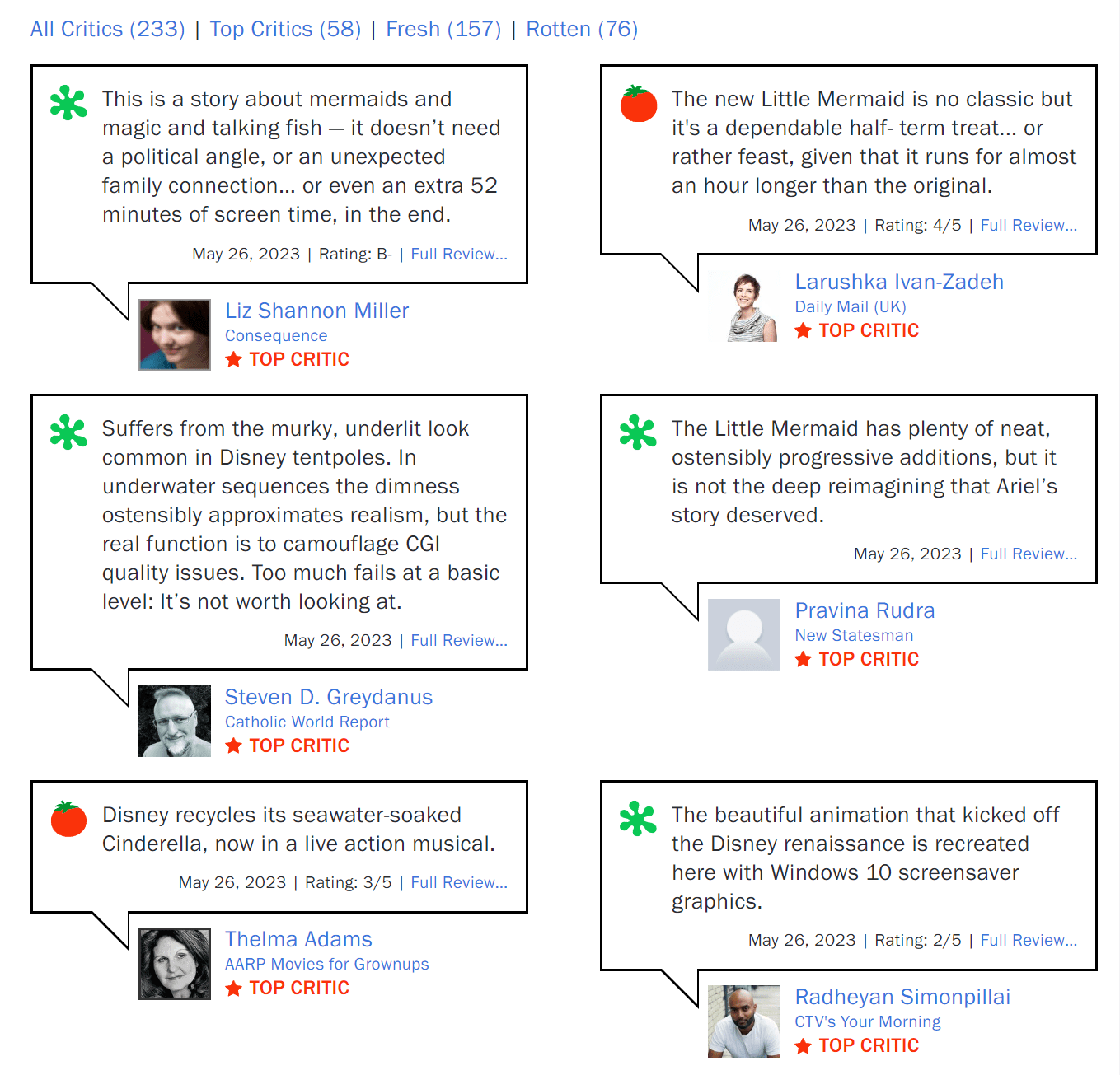 问题主要出自黑人女演员海莉·贝利饰演美人鱼,让国内观众难以接受。因此有观众调侃“建议找个脏辫黑王子来配小美人鱼”,而童话幼稚的故事、选角的短板让这部电影在美国本土口碑也非常一般,烂番茄仅67%的新鲜度,五条权威评价四条差评,除了吐槽故事、创作角度外,还有影评人批评电影制作,认为CG质量不过关。