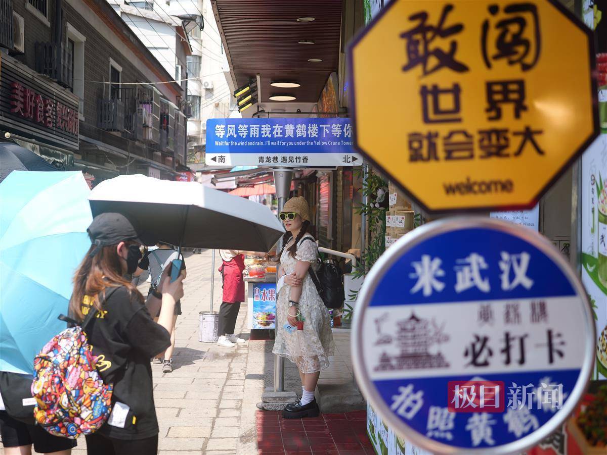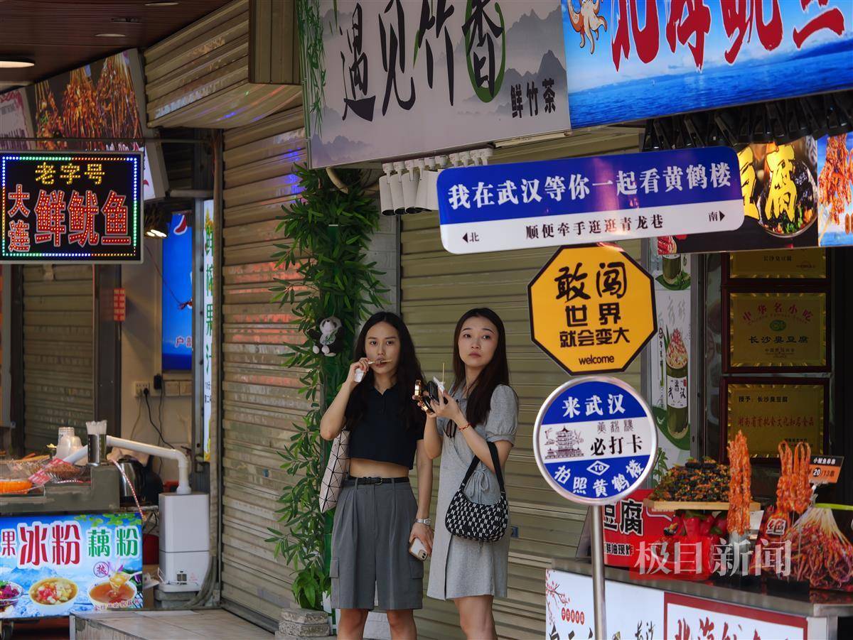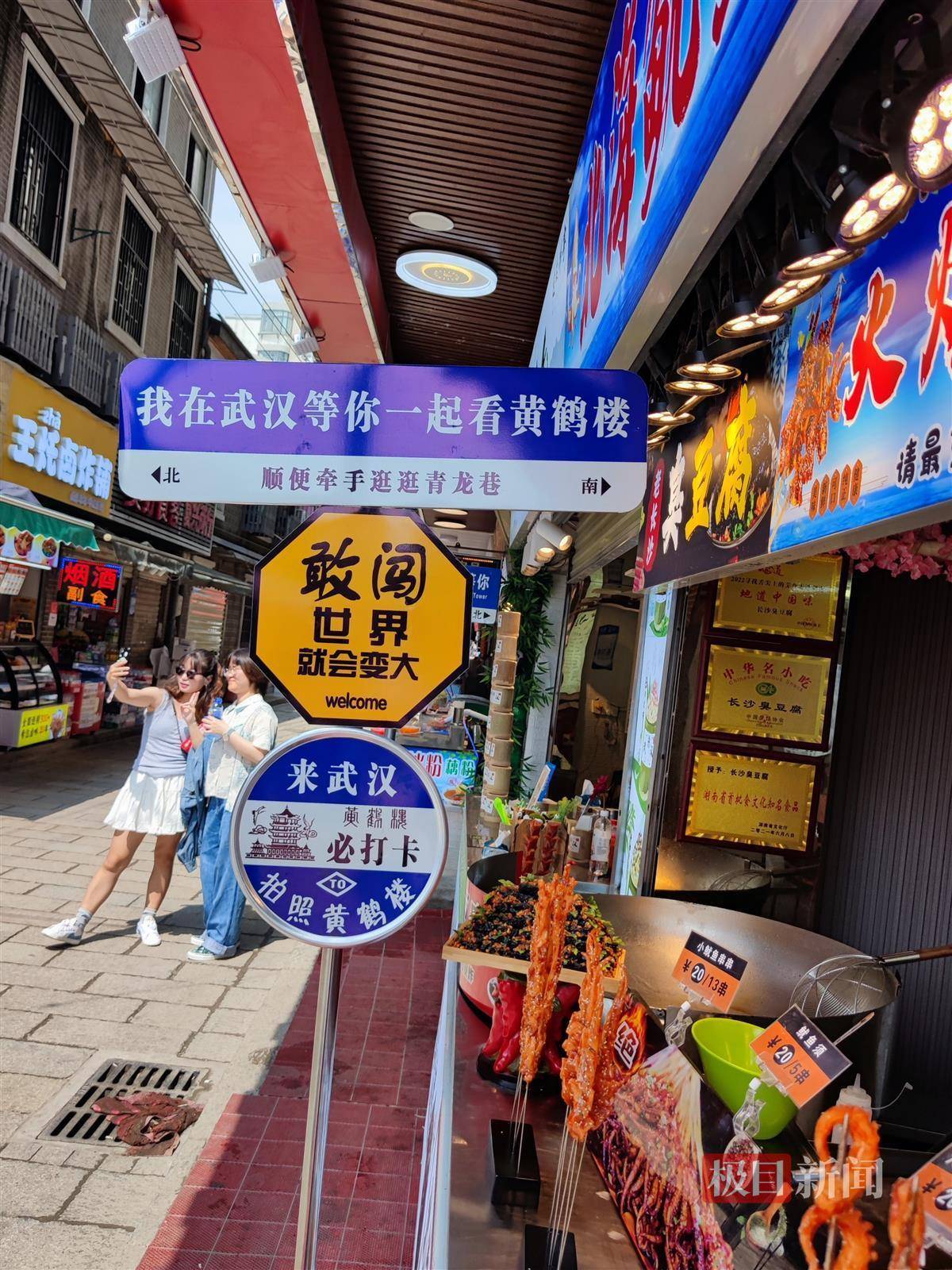 从巷口往里走,店家精心设计的广告牌格外打眼,“我在武汉等你一起看黄鹤楼”“顺便牵手逛逛青龙巷”等特色“路牌”也吸引来不少游客打卡。