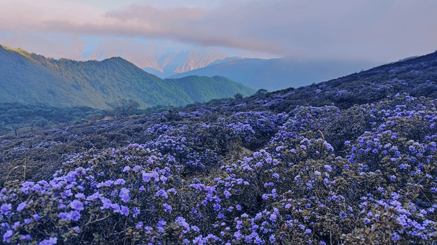 近段时日,恰逢玛娜茶金山上的杜鹃花盛装绽放,在夏日的微光之中,万余亩野生杜鹃连绵盛绽,雪山花海互映生辉。