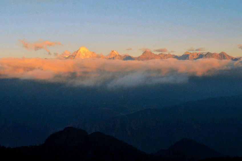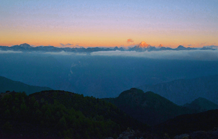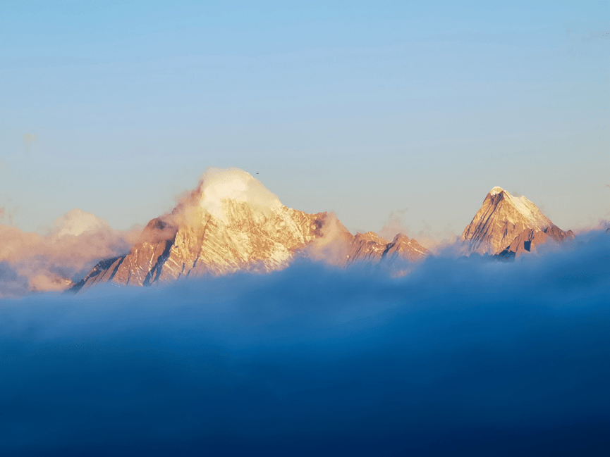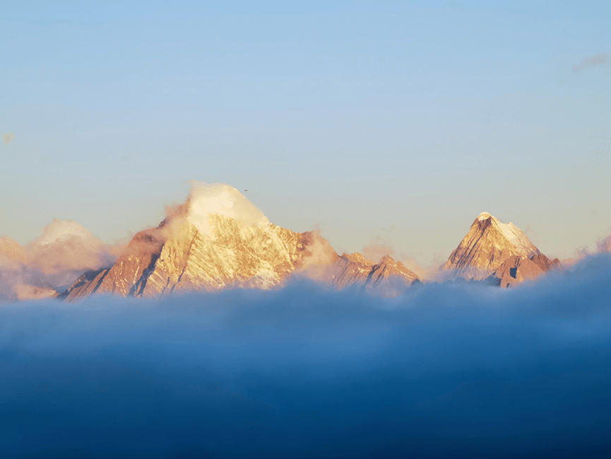 当金芒刺破云层倾洒在雪山上的那一刻,世间万物仿佛都失去了颜色,只有那令人震撼的日照金山是天地间唯一的绝色,那一瞬间,金山好像也有了生命,昭告着大自然的伟大,折射的金光洒向美好的人间。