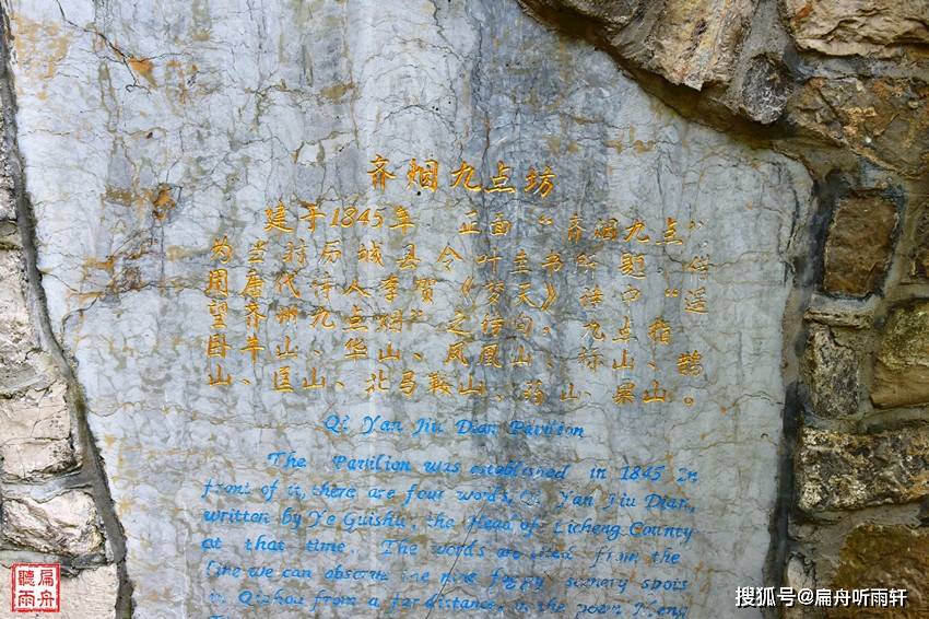 歇歇脚,再往上走,就是著名的“齐烟九点”坊。“齐烟九点”的“齐”特指济南,意思是站在牌坊的位置往北看,可以看到城北的九座山峰点缀在黄河沿岸。这是一座二柱一楼式的木头牌坊,由清道光二十五年(1845年)历城县令叶圭书所建。“齐烟九点”四字,取自唐朝诗人李贺《梦天》诗“遥望齐州九点烟,一泓海水杯中泻”。