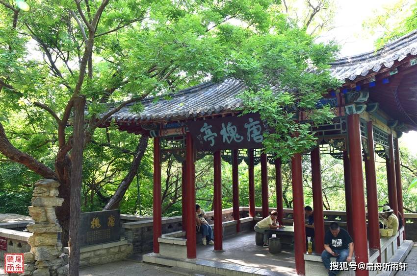 沿山路继续向上,很快就到了唐槐亭。唐槐亭因亭前的一棵老槐树而建。老槐树虽然树心已空,但仍然枝繁叶茂,另有一株小槐树,穿过树干枯洞,蓬勃生长,犹如慈母抱子,所以又叫母抱子槐。相传,唐朝大将胡国公秦琼,经常到山上来为母亲上香祈福,每到此处都要将马拴在这棵树上,这棵老槐树也被称为“秦琼拴马槐”。