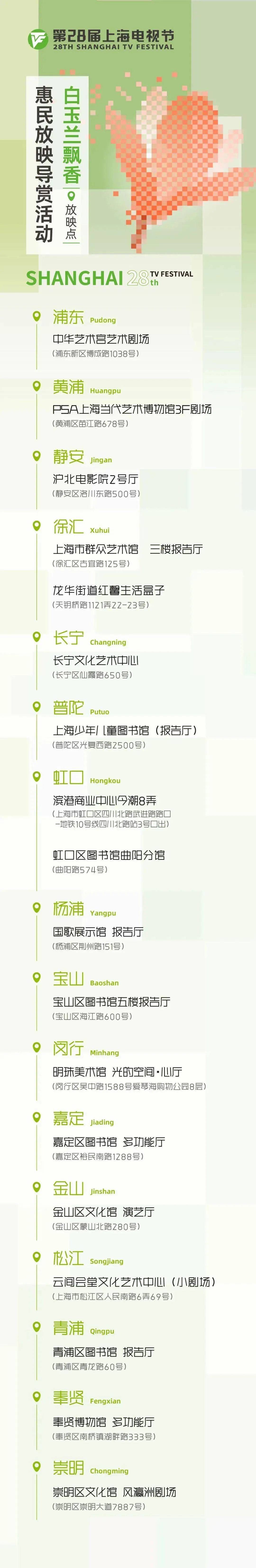 另外,今年隶属于上海电视节“白玉兰飘香”节目展播的线下惠民放映活动将全面焕新。在上海市文化和旅游局的指导下,上海国际影视节中心、上海市群众艺术馆、上海电视艺术家协会三方携手,协调和布点全市各级各类专业文化场馆和机构力量,充分利用各自特色资源优势,进一步打造“家门口的电视节”。