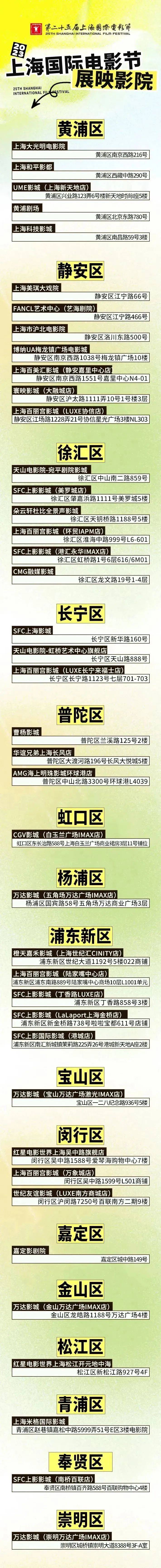 其中包括备受影迷关注、陪伴了上影节30年的上海影城也再次位列展映影院名单,修葺一新后与电影节一同归来。