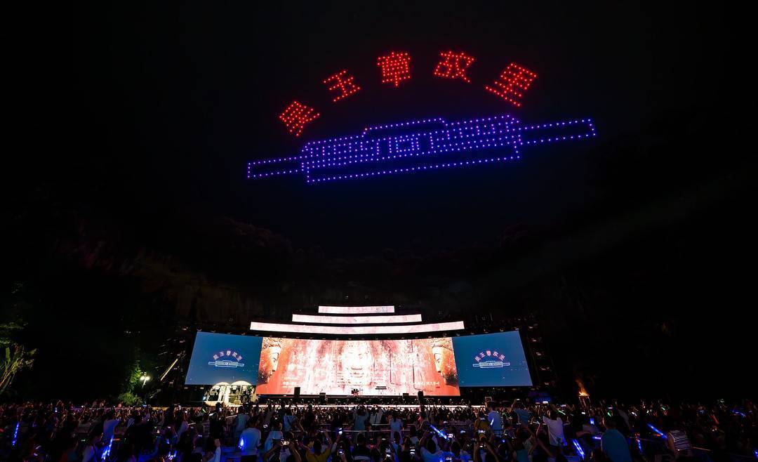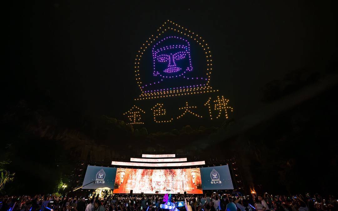 随后,500架无人飞机升空在荣县大佛文化旅游区带来一场光影秀,无人机群变换队形,组合成山水佛城·烟火荣州、西部陶都、五彩荣州、荣县欢迎您等10个造型,以震撼的视觉效果和深刻的主题表演,淋漓尽致展现了荣县文化旅游的独特魅力。