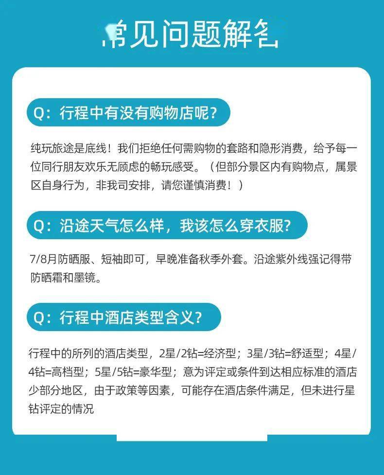 3、 行程中的所列的酒店类型,2星/2钻=经济型;3星/3钻=舒适型;4星/4钻=高档型;5星/5钻=豪华型;意为评定或条件到达相应标准的酒店,少部分地区,由于政策等因素,可能存在酒店条件满足,但未进行星钻评定的情况;