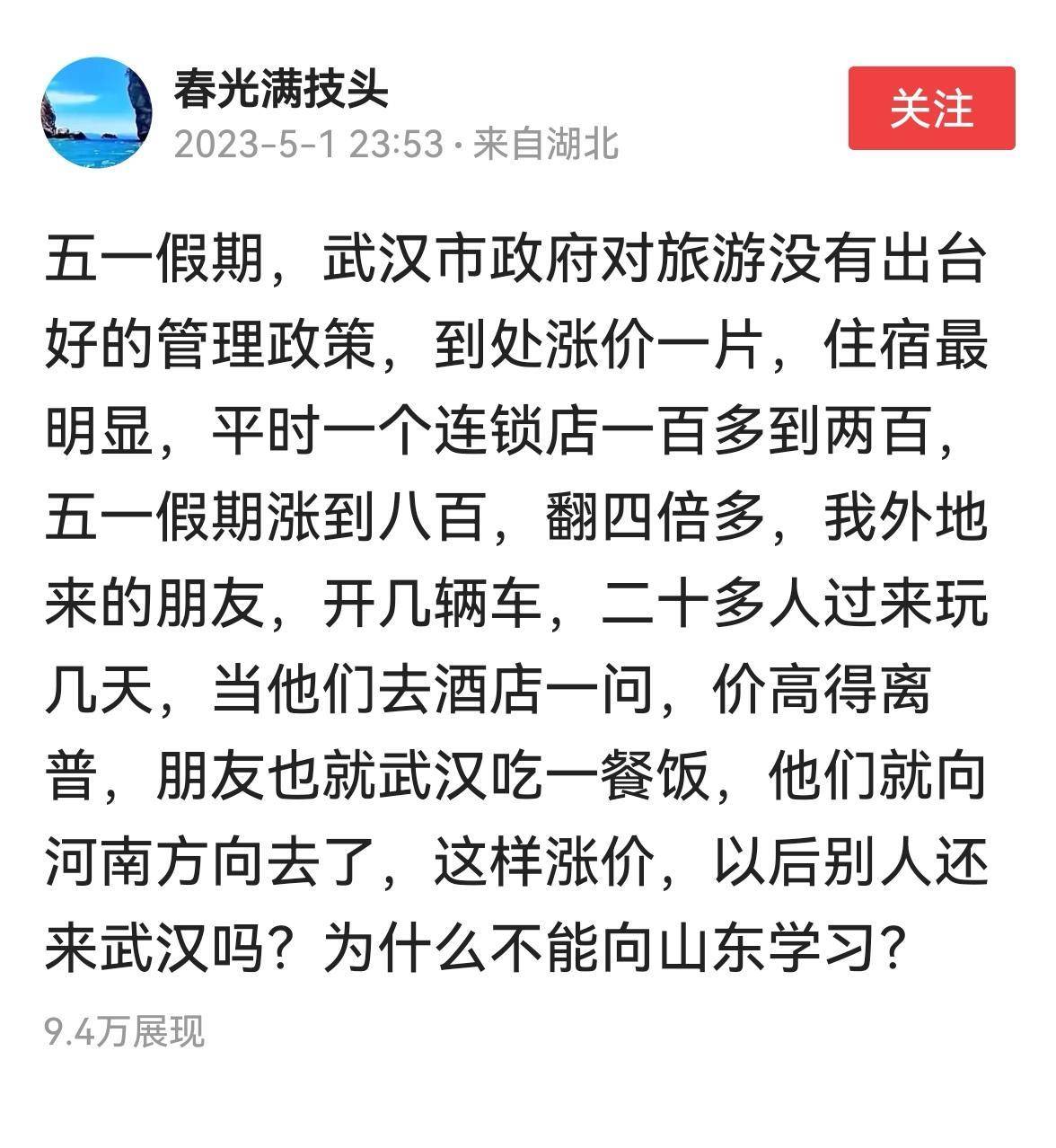 春光漫记发文称:五一假期期间,武汉市政府未出台新的旅游管理规定。物价到处都在上涨,但最明显的是住宿。平时连锁店100多200多,五一假期涨到800多,四次多,外地朋友开几辆车来,20多人来玩一会几天。我往河南方向走。涨价了,以后还有人来武汉吗?为什么不能向山东学习呢?【以上来自春光漫记头】