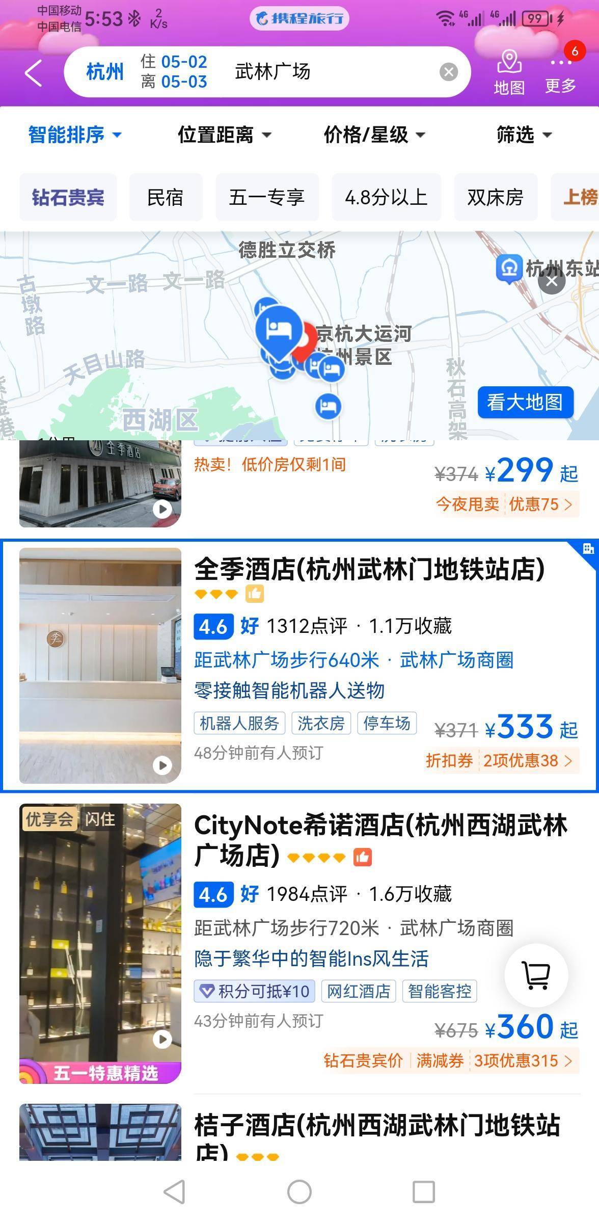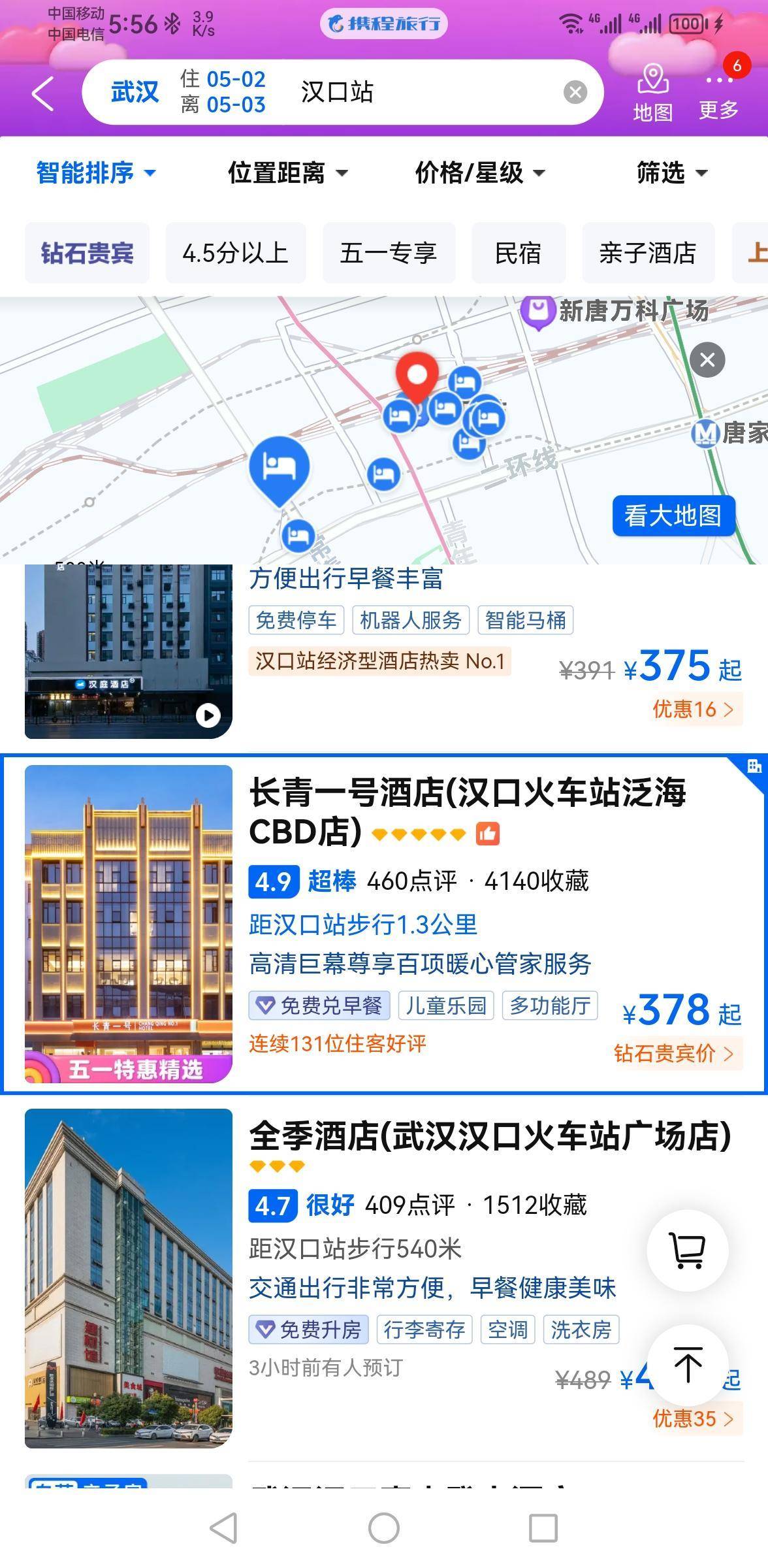 我也查了长沙五一广场附近的情况,和武汉的汉口站附近差不多,可能低一点。如果我没记错的话,武汉的正常物价比长沙的要高。也查了杭州武林广场附近的价格,常年入住的酒店比汉口站附近的便宜。有人说今年杭州的五一旅游冷了,看来真的是少之又少。