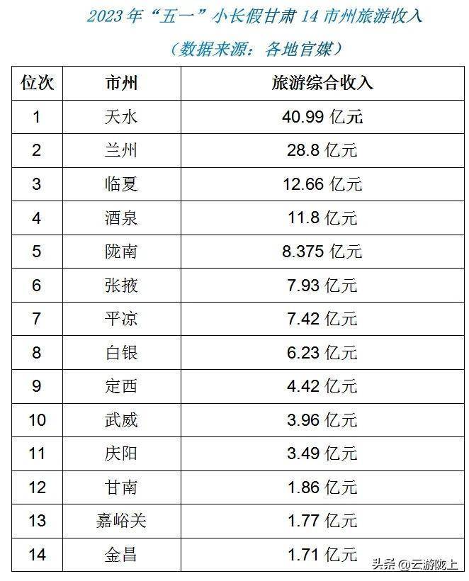甘肃其他市州在这个“五一”均收获了旅游带来的红利,呈现出游客量、旅游综合收入的双双增长。全省14市州旅游收入具体如下——