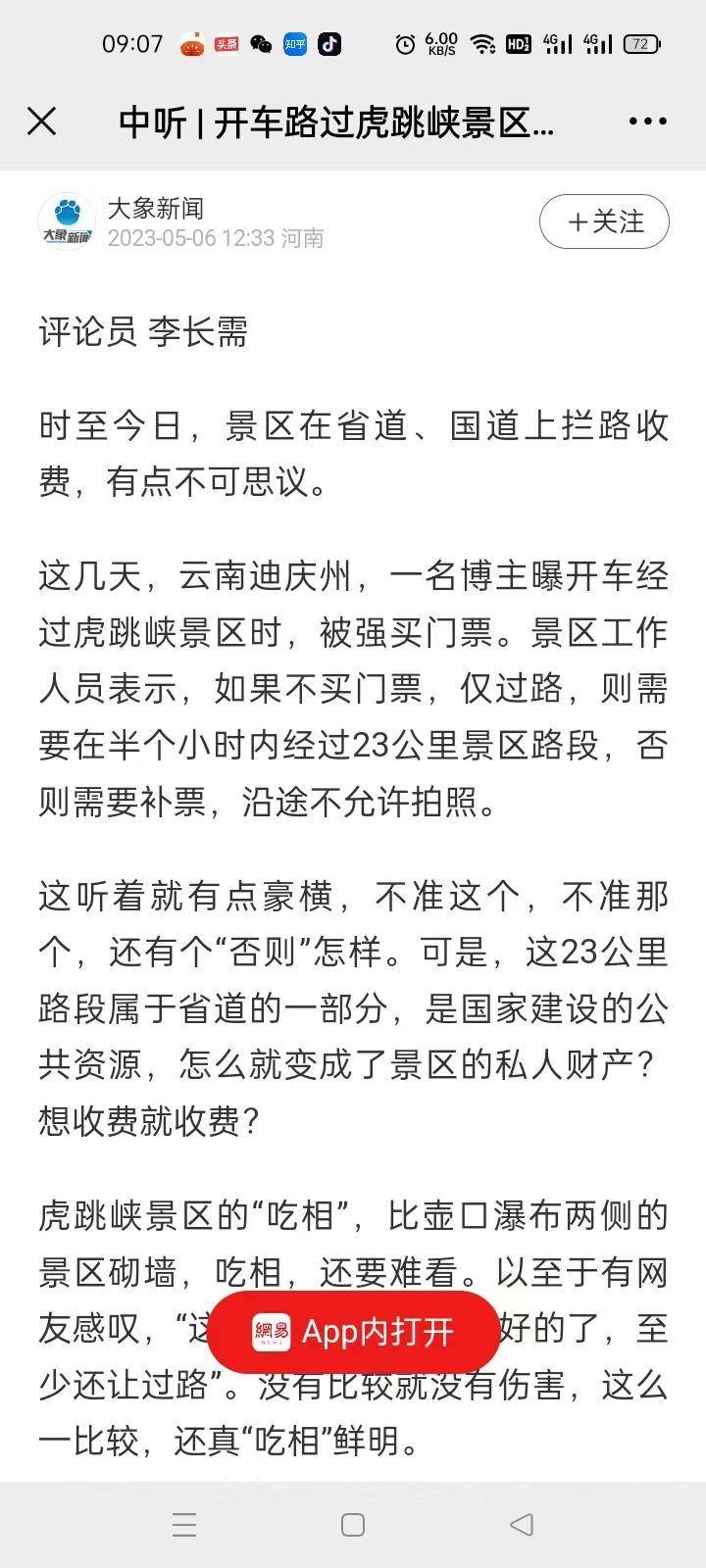 看到云南迪庆州的一个帖子,有博主反映省道途经虎跳峡景区时被强制买票。