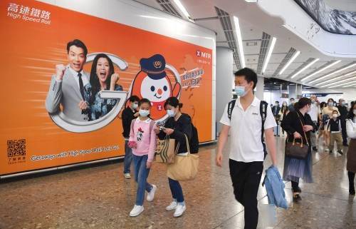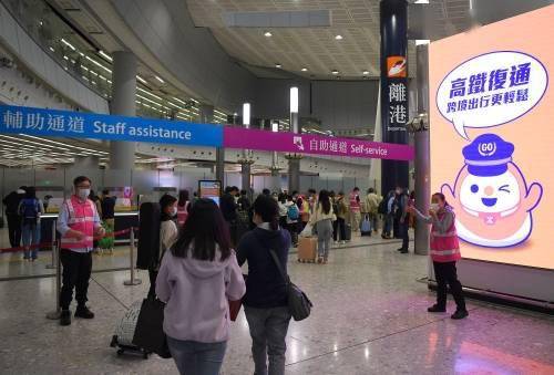 香港高铁西九龙站7点左右已有大批旅客抵达离港大堂。港铁公司于车站内安排高铁吉祥物“高铁队长”到场,不少旅客上前合影,并有工作人员向旅客派发行李牌等纪念品。港铁公司预计当日有超过3万名乘客乘搭高铁前往内地,已经加派超过100名工作人员在场协助,现场整体运作顺畅有序。