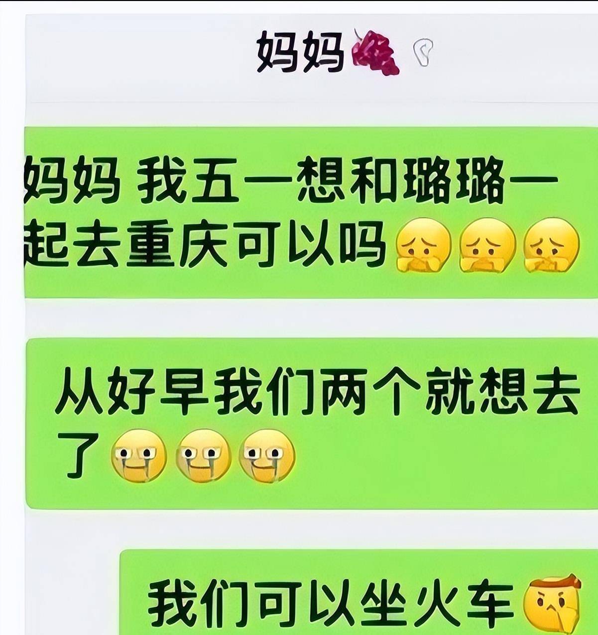 从聊天记录可以看出,这名女大学生早就想和好友璐璐一起去重庆了。可她没有钱,就想找妈妈要,可是妈妈经济困难,没钱供她去重庆玩。