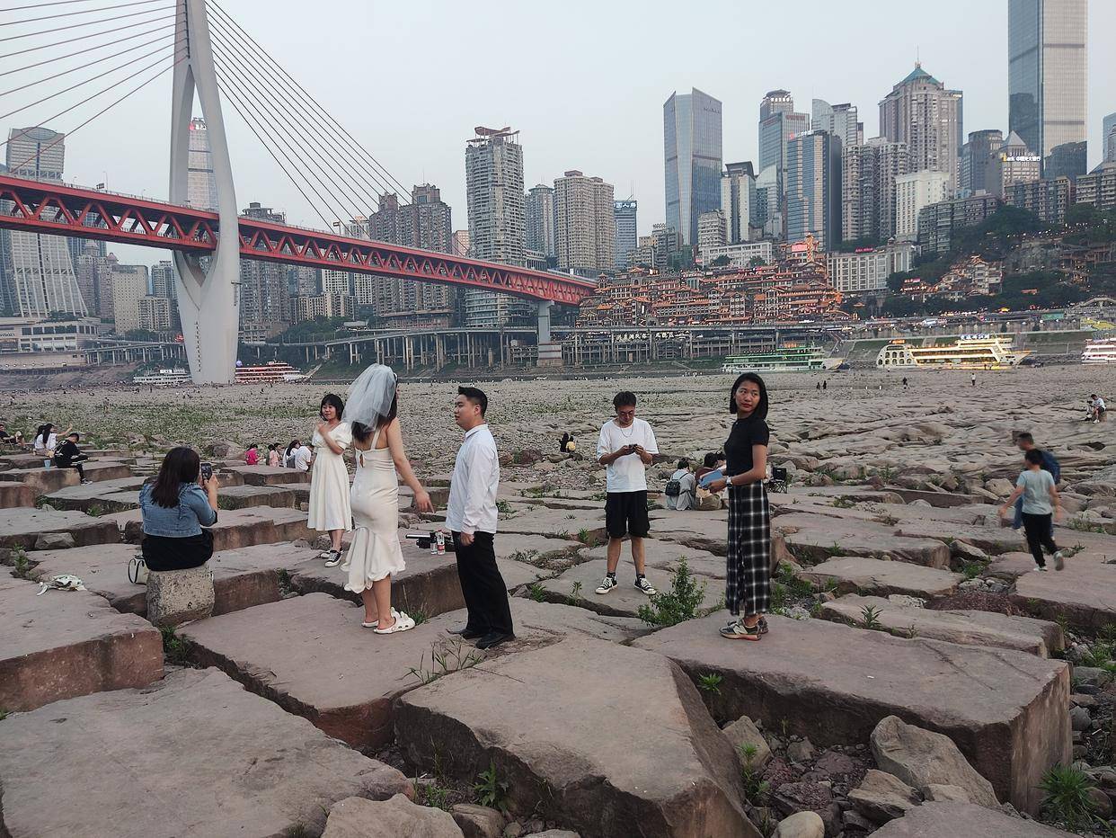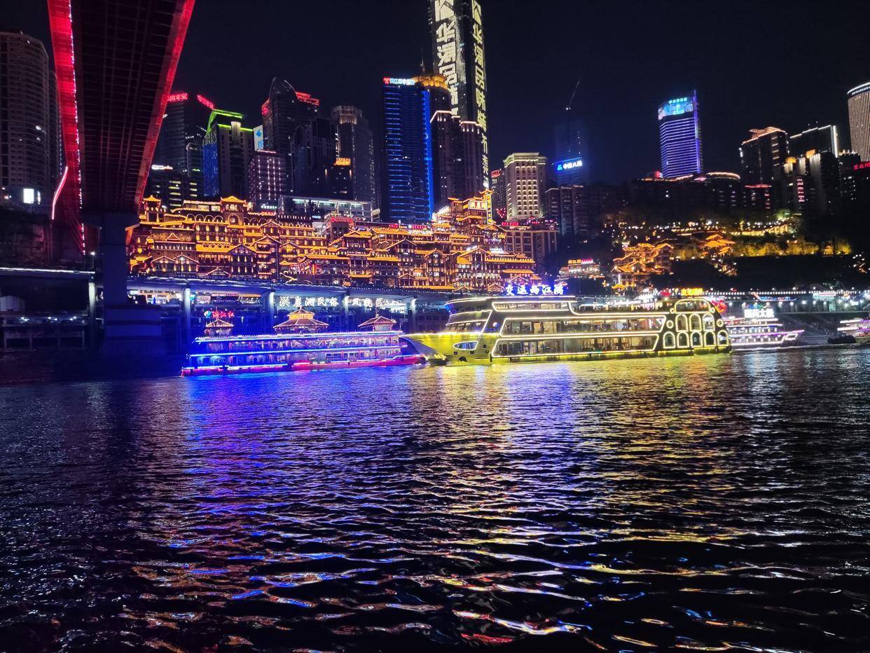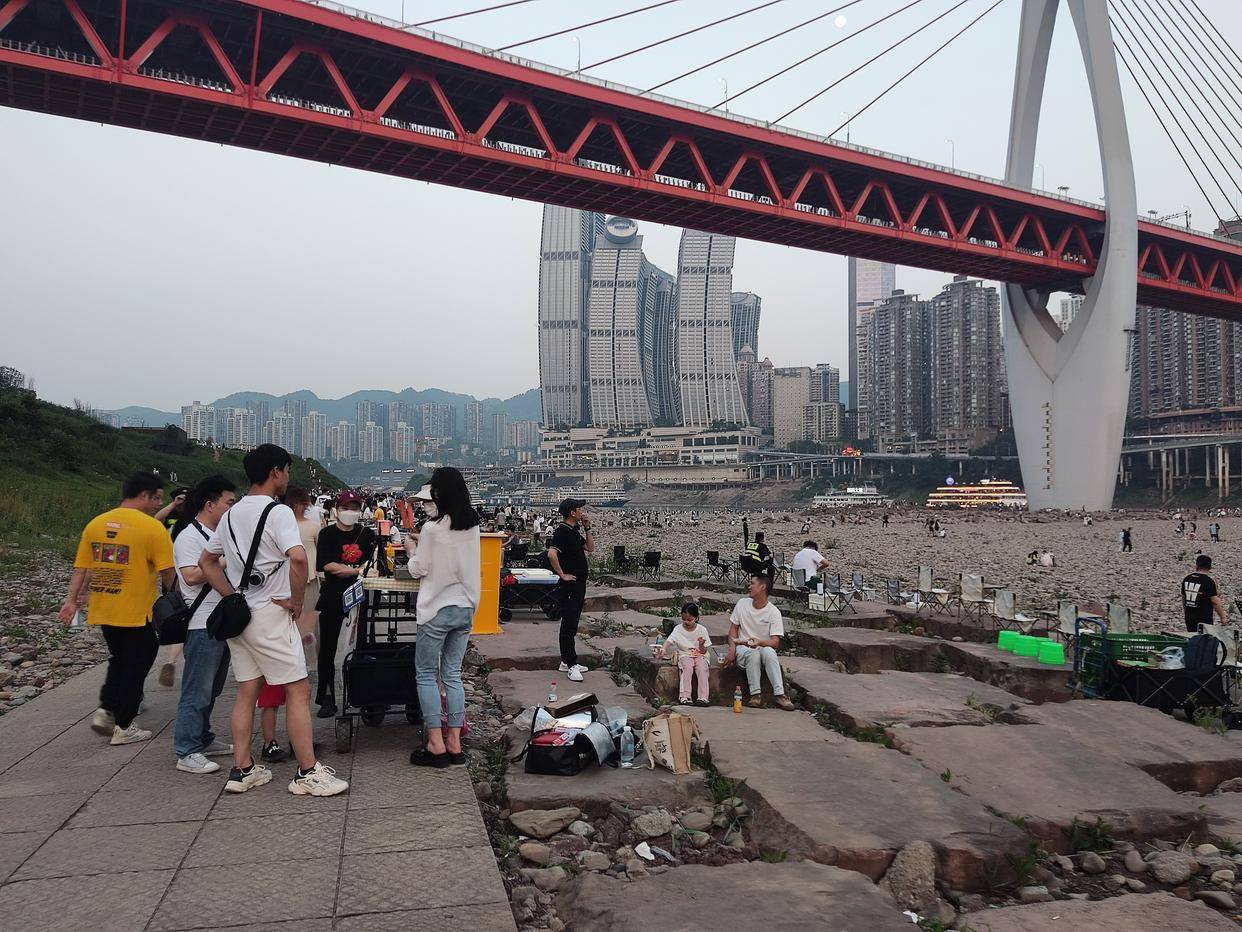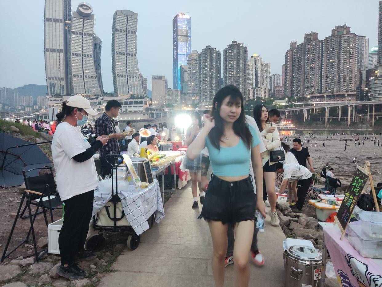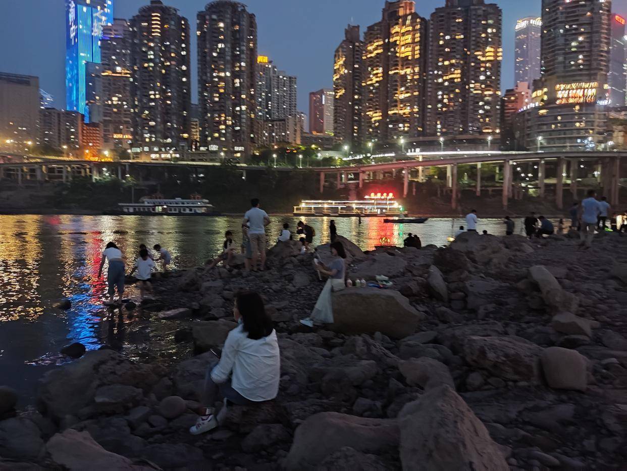 嘉陵江的石滩可能是因为它位于洪崖洞内,隔着来福士广场。观赏位置极佳,没有交通噪音。我不知道什么时候开始的。被游客发现,逐渐在网络上流行开来,尤其是在夜幕降临的傍晚,更是人山人海,有人在河边嬉戏,有人在岩石间乘凉,还有更多的游客集中在健身步道上的野市。野市灯火通明,热闹非凡。