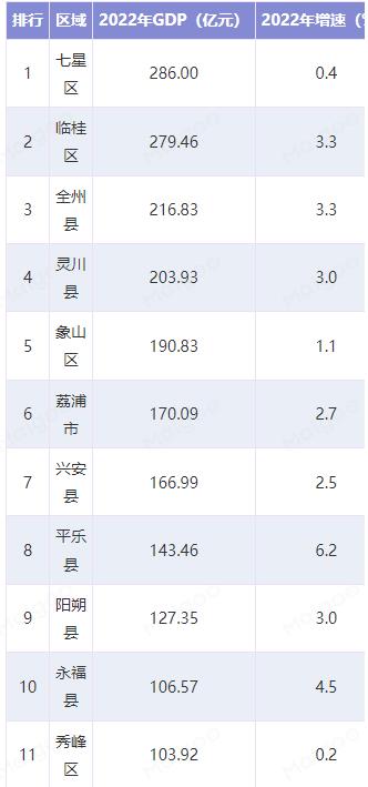 2023年桂林县市区生产总值中,七星县、临桂县位居第一,其次是七星县、临桂县。