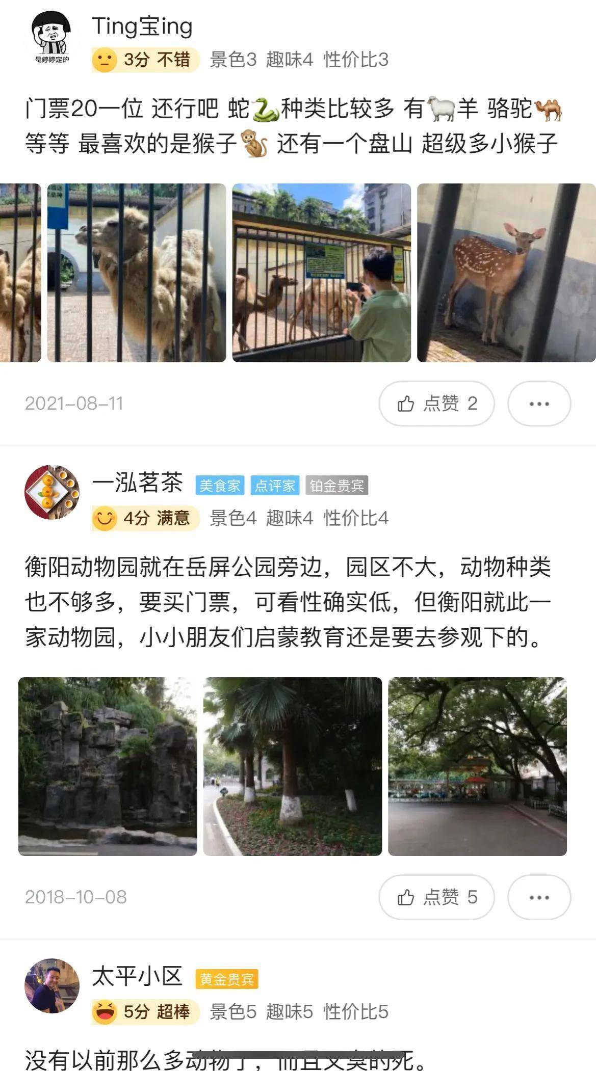 从4月21日和23日的评价照片可以看出,当时梅花鹿还在梅花笼里。衡阳动物园有骆驼、猴子、鸵鸟等动物。
