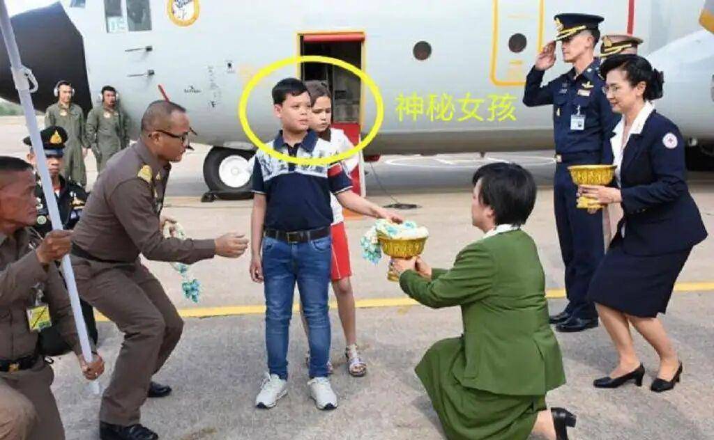 提帮功年轻的发型,脚踩白色运动鞋,小女孩身穿白色上衣,红色短裙,紧紧跟在提帮功的身后,有一种小鸟依人的感觉,看来提帮功给了小女孩安全感。二工作人员也是全程下跪,这就是所谓的泰国下跪礼。