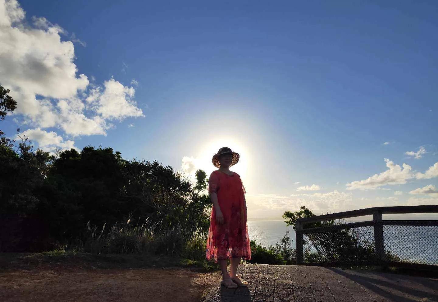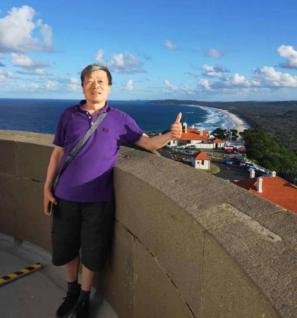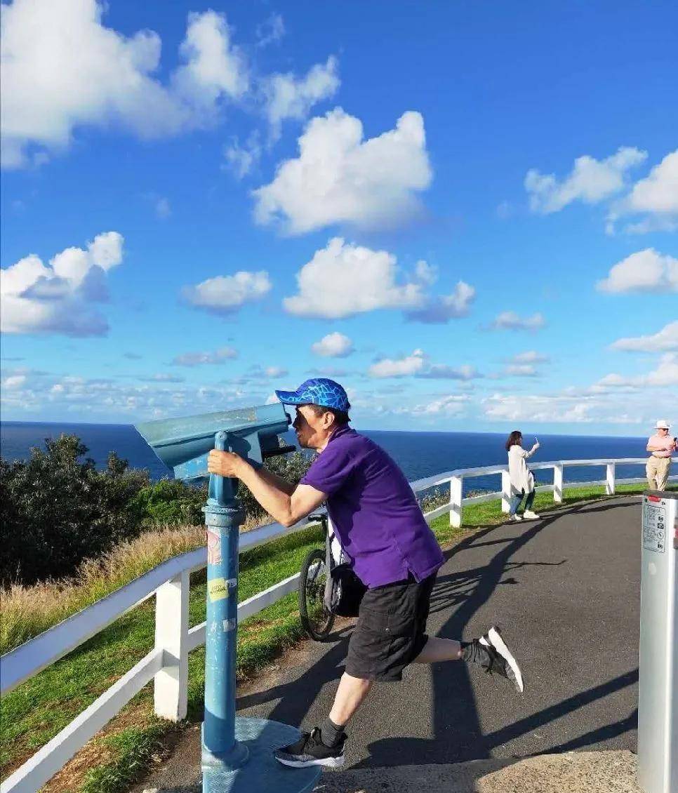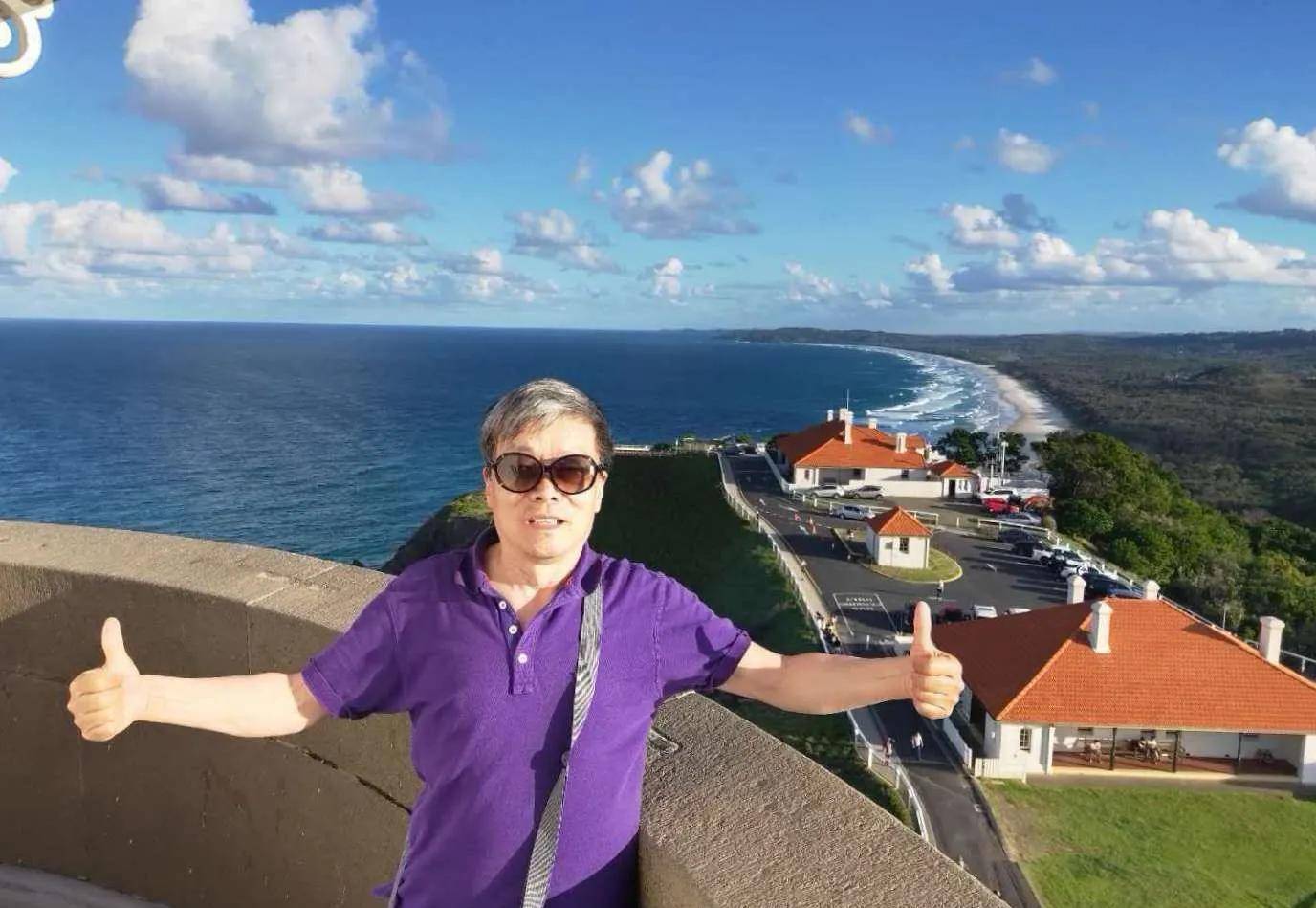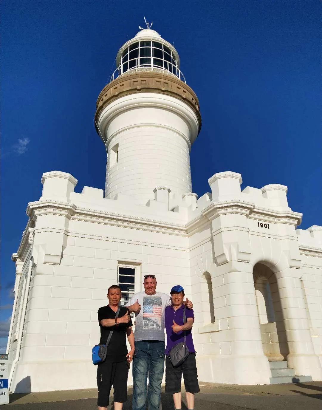 当我们告诉他了我们是从布里斯班过来的,他遗憾地摊了摊手,并提出与我们拍照留念。澳洲男士左右看了一下,没有找到那两个家人,只得用各自的手机在拜伦塔下拍下我们三个人难忘的瞬间……。